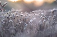 close up van een plantje in winterrust, bedekt met een laagje rijp, wat glinstert in het licht van de opkomende zon