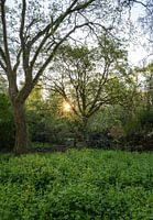 Portret in het arboretum van Wageningen, waar de zon opkomt achter een boom in het groene landschap.