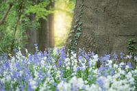 Portret van een boomstam met klimop, met op de bodem boshyacinten. Op de achtergrond zie je het gouden licht van de opkomende zon. De foto is gemaakt in het arboretum Belmonte in Wageningen.