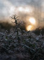 close up van een struik in winterrust, bedekt met een laagje rijp, en de zonsopkomst op de achtergrond