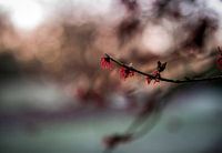 close up van de tak van een Hamamelis virginiana, ofwel Amerikaanse toverhazelaar, met een zachte bokeh achtergrond