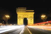 Prachtige opname van de Arc de Triomphe in Parijs, Frankrijk, 's nachts met verkeer op de Champs-Elysees