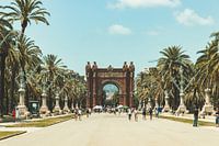 Een pad richting de Arc de Triomf waar een hondenshow wordt gehouden. links en rechts van de weg staan palmbomen symmetrisch uitgelijnd