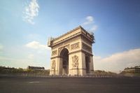 Prachtige lange sluitertijd opname van de Arc de Triomphe in Parijs, Frankrijk, in de lente met een paar wolkjes en een heldere lucht