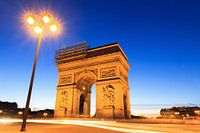 Prachtige opname van de Arc de Triomphe in Parijs, Frankrijk, na zonsondergang in het blauwe uur met verkeer