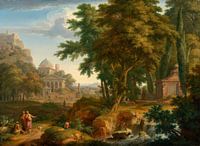 Arcadisch landschap met de genezing van een verlamde door Petrus en Johannes, Jan van Huysum, 1724 - 1725