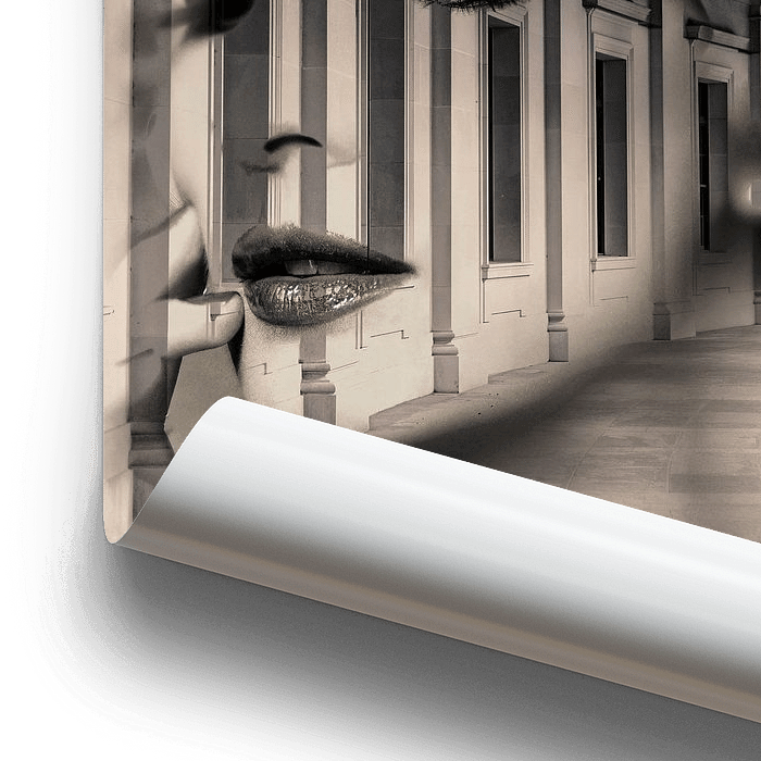 Het hoofdonderwerp is een jonge vrouw, wiens gezicht gedeeltelijk verborgen wordt door het beeld van een zuilengalerij met…