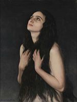 Op dit naaktportret staat het model bloot weergegeven waarbij haar lange haren haar borsten bedekken. De meid kijkt vroom naar boven.