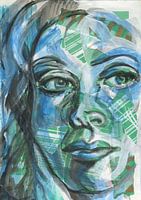 Portret van een vrouw. Dit is een collage gemaakt van scheursels van bedrukt papier met grafische patronen, gecombineerd met lagen verf. Door de transparantie ontstaat een bijzonder gelaagd effect: alsof de vrouw door een raam kijkt en er een reflectie van de gebouwen op haar gezicht te zien is. Natuurlijk is dit portret op je eigen manier te interpreteren.