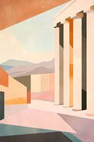 Een harmonieuze mix van zachte aardetinten en heldere lijnen brengt tijdloze architectuur tot leven. De majestueuze zuilen, omringd door glooiende heuvels, nodigen je uit om te dromen. Dit kunstwerk is ideaal voor de woonkamer, creëert een ontspannen sfeer en inspireert tot gesprekken over geschiedenis en esthetiek.