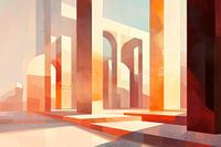 Een harmonieus samenspel van zachte kleuren en majestueuze zuilen ontvouwt zich voor de kijker. De warme aardetinten en gebogen architectuur geven de kamer een uitnodigende sfeer die uitnodigt om te dromen. Perfect voor een woonkamer om een rustige en inspirerende oase te creëren.