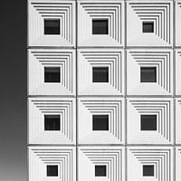Het project bestaat een ontvangstgebouw, met onder andere een auditorium en een crematorium (ovengebouw) op de bestaande begraafplaats. Van het crematoriumgebouw zijn de gevels en binnenwanden opgetrokken uit witte geprefabriceerde betonelementen, dragend en stabiliserend, die zowel aan de buiten- als de binnenzijde zichtbaar zijn als schoonwerk, ‘architectonisch’, beton. Het gebouw is ogenschijnlijk opgebouwd uit solide blokken van 1 x 1 x 1 meter. Als vrijwerk heb ik een fotoserie van dit gebouw gemaakt. De foto die ik hier presenteer is een detail van de buitengevel. Ik houd van de grafische, minimalistische uitstraling van dit beeld.