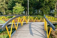 Geel geschilderde voetbrug over een klein kanaal in een Nederlands natuur park. Een zonnige dag aan het einde van de zomer en aan het begin van de herfst.