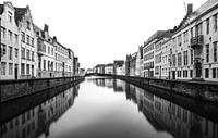Zwartwit opname van Brugge met historische panden welke reflecteren in de spiegelrei.