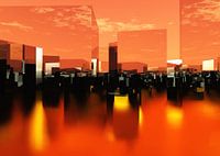 Een fictief "downtown" uitzicht, met wolkenkrabbers die lijken op de bankwijken in grote steden, bestaande uit kubusvormige elementen, ondergedompeld in een geel en oranje kleurenspel met reflecties en schaduwen voor een hemel die bedekt is met een dunne sluier van wolken.