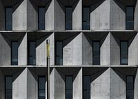 Architectuurfoto van een gevel van een modern betonnen gebouw met op de voorgrond een gele lichtmast in Pamplona, Spanje.
