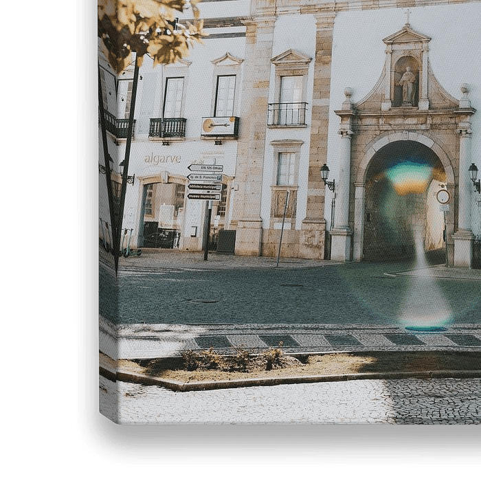 Een foto van Arco da Villa in Faro stad vroeg op de dag met wat tegenlicht en lensflare. Bovenop deze boog zitten meerdere ooievaarsnesten. Als je onder deze boog doorloopt kom je uit bij Castelo do Faro.