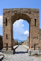 Caligula's Boog (Arco di Caligola) in de oude stad Pompeii, Italië. De boog werd opgericht ter ere van Julius Caesar Germanicus, bekend als Caligula, aan de Via di Mercurio. De boog gewijd aan keizer Nero is zichtbaar door de opening van de boog.