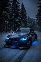 De nacht valt in het besneeuwde bos terwijl deze BMW M4 het pad verlicht. De levendige blauwe onderverlichting weerkaatst op de witte sneeuw en past perfect bij de scherpe LED-koplampen. Het lijkt wel een hightech roofdier dat rust in een winters wonderland, klaar voor een sprint in het holst van de nacht.