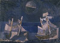 Twee schepen, zeilschepen, varen voorbij tegen een donkere achtergrond in blauw met de maan aan de hemel.