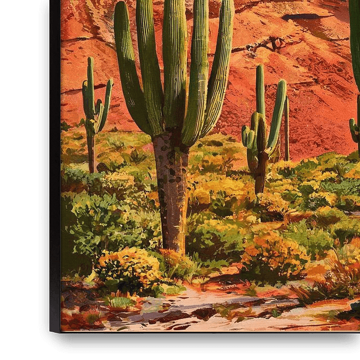 Deze vintage reisposter van Arizona toont een adembenemend woestijnlandschap, gekenmerkt door hoge saguaro-cactussen en kleurrijke rotsformaties. De warme rood- en oranjetinten van het gesteente contrasteren prachtig met de heldere blauwe lucht, terwijl het zonlicht het landschap een gouden gloed geeft. De stijl doet denken aan…