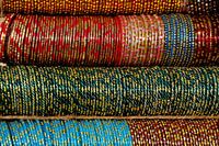 Veel kleurige kunststof armbanden op een markt in Orissa, India.