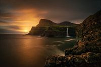 Arnafjall summit and Mulafossur waterfall in sunset, Faroe Islands