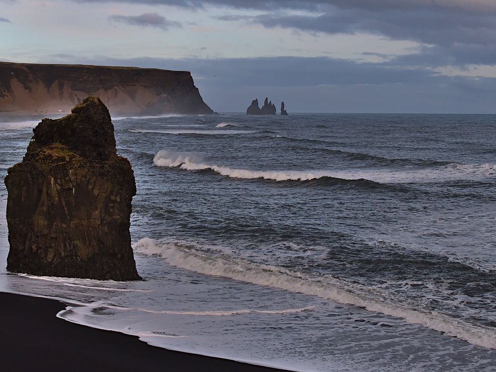 Uitzicht over het zwarte strand Reynisfjara aan de zuidkust van IJsland bij Vík í Mýrdal in de avond met de beroemde rots Arnardrangur tijdens een sterke branding.