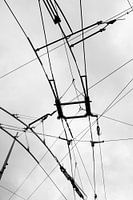 Zwart-wit foto van het lijnenspel van de elektriciteitskabels van de trolleybussen. Arnhem is een van de laatste Nederlandse steden waar de trolleybus nog rijdt. Een bijzonder en milieuvriendelijk systeem.