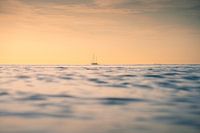 Klein zeilschip met groots bereik om rond de wereld te gaan varen. Hier ligt dit schip voor anker aan de Nederlandse kust en in een zonsondergang avond gloed.