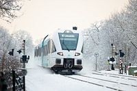 Een trein van vervoerder Arriva is onderweg tussen Groningen en Leeuwarden en rijdt hier net voorbij Buitenpost in westelijke richting in een prachtig besneeuwd winterlandschap. Door de hoge snelheid van de trein ontstaat er stuifsneeuw.