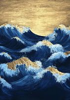 Blauw klein formaat met enorme golven en gouden randen op het zeeoppervlak in een minimalistische stijl, een vlak schilderij met hoogwaardige goud- en zeekleuren, een handgeschilderde textuur, een verguld patroon geïnspireerd op Chinese kunst, een verguld kunstschilderij, een aquarel en een lijnschilderij met goudfolie.