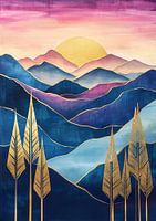 Een sereen berglandschap bij zonsopgang, geschilderd in goud en blauw met bomen en bergen waarboven de zon opkomt. De lucht is roze en paars. Art-decostijl met geometrische vormen en lijnen.