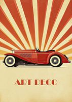 Vintage poster van een art deco auto, tekst "ART DECO", zonnestralen, eenvoudige vormen, rood en beige kleurenpalet.