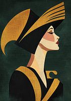Art Deco portret van een elegante vrouw in profiel, met een zwarte en gouden hoed met brede rand, in een vlakke 2D stijl, met een vintage palet en een donkergroene achtergrond. Dit art deco posterontwerp in Julesanyon-stijl is eenvoudig, minimalistisch en een platte vectorillustratie met geometrische vormen, een papiereffect met textuur, schaduwen met hoog contrast, sterke highlights, een evenwichtige compositie, scherpe focus, diepte, perspectief, precieze details en schone randen, allemaal in hoge resolutie.