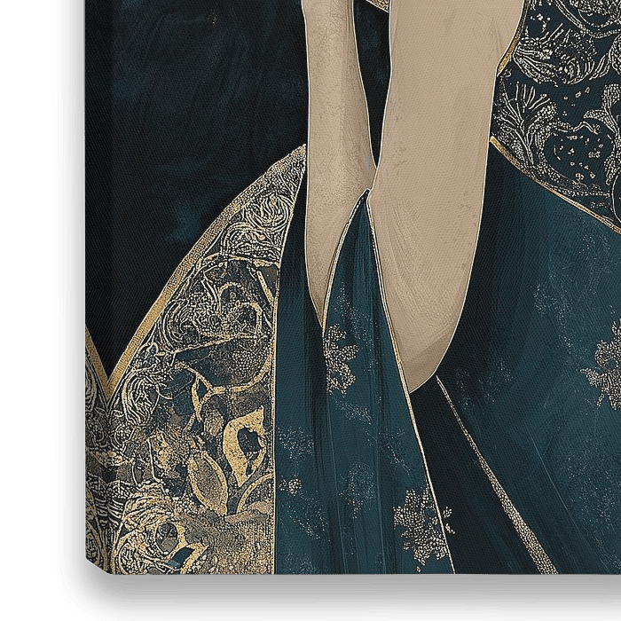 Art Deco portret van een androgyne vrouw met kort zwart haar, die een donkerblauwe zijden jurk draagt met gouden patronen, gouden oorbellen en een halsketting. Ze staat voor een gouden aureool op een achtergrond met sterren, in een halflichaamsshot. Illustratie in de stijl van Anna Dittman en Sam Lee, met een kleurenschema in donker…