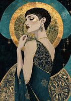 Art Deco portret van een androgyne vrouw met kort zwart haar, die een donkerblauwe zijden jurk draagt met gouden patronen, gouden oorbellen en een halsketting. Ze staat voor een gouden aureool op een achtergrond met sterren, in een halflichaamsshot. Illustratie in de stijl van Anna Dittman en Sam Lee, met een kleurenschema in donker…