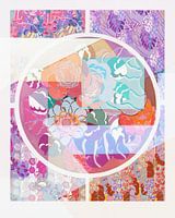 Mixed media kunst, vintage Art Deco design met bloemen in pastel kleuren en grafische vormen op vintage canvas papier. Vrolijk fantasie abstract.