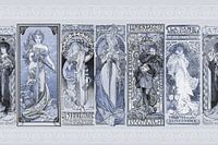 Naadloos ontwerp in blauw-grijs uit de Art Nouveau periode, samengesteld uit affiches van mooie vrouwen gemaakt door de beroemde schilder Alphonse Mucha
