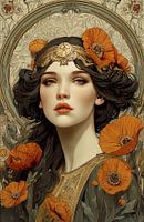 Een art nouveau kunstwerk waarin elegantie en natuur samensmelten. Weelderige oranje klaprozen omringen een dromerig portret, versierd met een gouden ornamentele hoofdband. De compositie ademt de karakteristieke Jugendstil-stijl met sierlijke lijnen en warme kleurtonen, waarbij het contrast tussen de zwarte lokken en de levendige bloemen een dramatisch effect creëert.