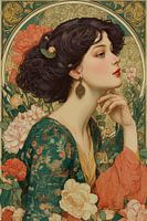 Een Art Nouveau-geïnspireerd kunstwerk dat de essentie van romantische elegantie vangt. Het portret toont een zijaanzicht in weelderige koraal- en jadetinten, omringd door weelderige bloemen en decoratieve elementen. De prachtige details in de zwarte lokken, de sierlijke juwelen en de verfijnde kledij in vintage stijl creëren samen een tijdloos beeld dat klassieke schoonheid ademt.