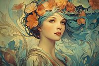 Een digitaal kunstwerk in Art Nouveau stijl, waarin turquoise en oranje elkaar ontmoeten in een dromerige compositie. Sierlijke oranje bloemen en elegante krullen omarmen de zachte contouren, terwijl een etherische sfeer wordt gecreëerd door de vloeiende lijnen en het gedempte kleurenpalet. Het werk straalt een tijdloze gratie uit die klassieke schoonheid verenigt met moderne digitale technieken.