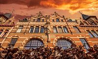 Het beeld legt niet alleen een gevel vast, maar ook de sfeer van een tijdperk waarin architectuur kunst en ambacht combineerde. Het zachte avondlicht valt op de fijne versieringen, accentueert de vloeiende vormen en legt een warme gloed over de gevelstenen.