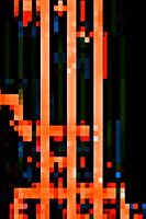 Een abstract werk, moderne Art Deco, geïnspireerd door Mondriaan, in oranje, rood blauw en groen tegen een zwarte achtergrond.