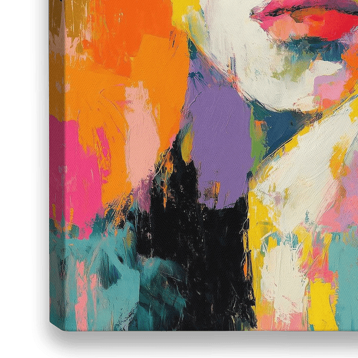 Een levendig expressief portret van een vrouw geschilderd in een semi-abstracte stijl met krachtige abstracte penseelstreken in diverse heldere kleuren. De achtergrond bevat een dynamische mix van kleuren die in elkaar overvloeien en contrasteren, waardoor het gezicht van de persoon wordt versterkt. De stijl is impressionistisch en…