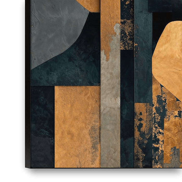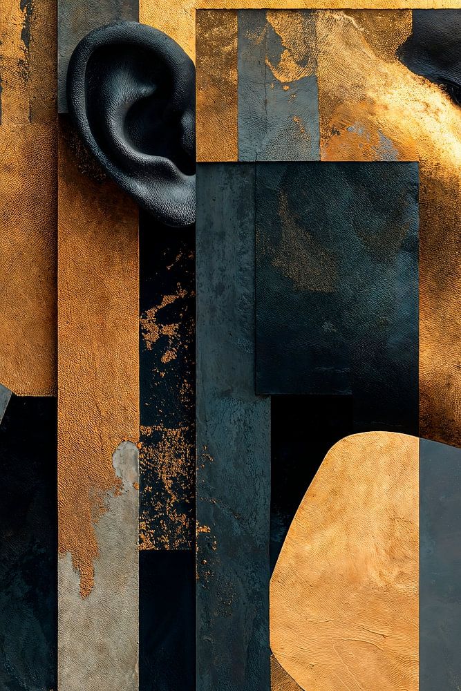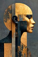 Een gestileerd portret van een vrouw in profiel, geïntegreerd met abstracte geometrische vormen en texturen. Het portret bevat metallic gouden accenten op haar gezicht en haar, gecontrasteerd met een achtergrond in gedempt donkergrijs, wat de moderne, artistieke uitstraling van het werk versterkt.