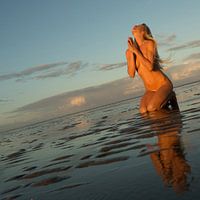 Artistiek naakt op de waddenzee met een naakt model in het ondergaande zon licht