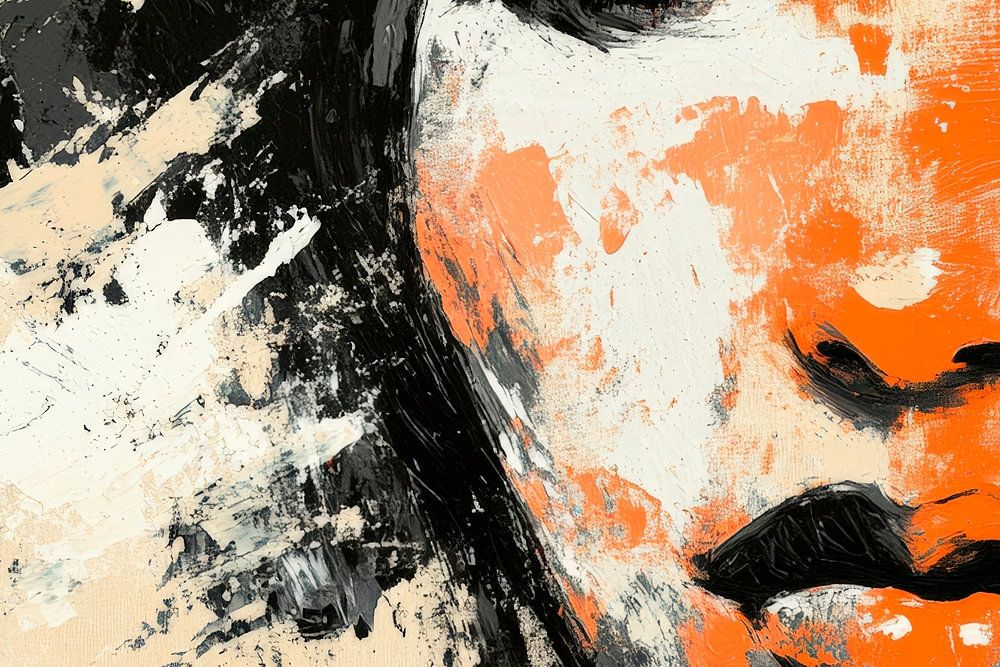 Een fascinerend portret ontmoet levendige kleurharmonieën die spelen met sterk oranje en zachte aardetinten. De intense blik en dynamische penseelstreken brengen een sterke emotie over. Dit kunstwerk is perfect voor de woonkamer, waar het een gesprek kan stimuleren en een artistieke sfeer kan creëren.