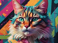 Dit kunstwerk toont een levendig portret van een kat, uitgevoerd in een opvallende combinatie van geometrische en abstracte stijlen. De invloeden van kubisme en popart zijn duidelijk zichtbaar, met scherpe lijnen en een rijk palet aan felle kleuren die de dynamiek van de kat tot leven brengen. Het gebruik van contrasterende tinten en overlappende vormen geeft een diepte en beweging aan het werk die het oog van de toeschouwer voortdurend prikkelt.