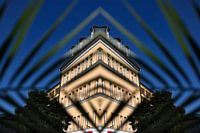 Een architectonisch tafereel dat op fascinerende wijze speelt met symmetrie en perspectief. In het midden staat een opvallend hoekgebouw dat opvalt door zijn heldere lijnen en warme, gelige gevelkleur. Het gebouw rijst majestueus op tegen een diepblauwe lucht, wat de elegante eenvoud van de gevel nog benadrukt. De rijen ramen en het…